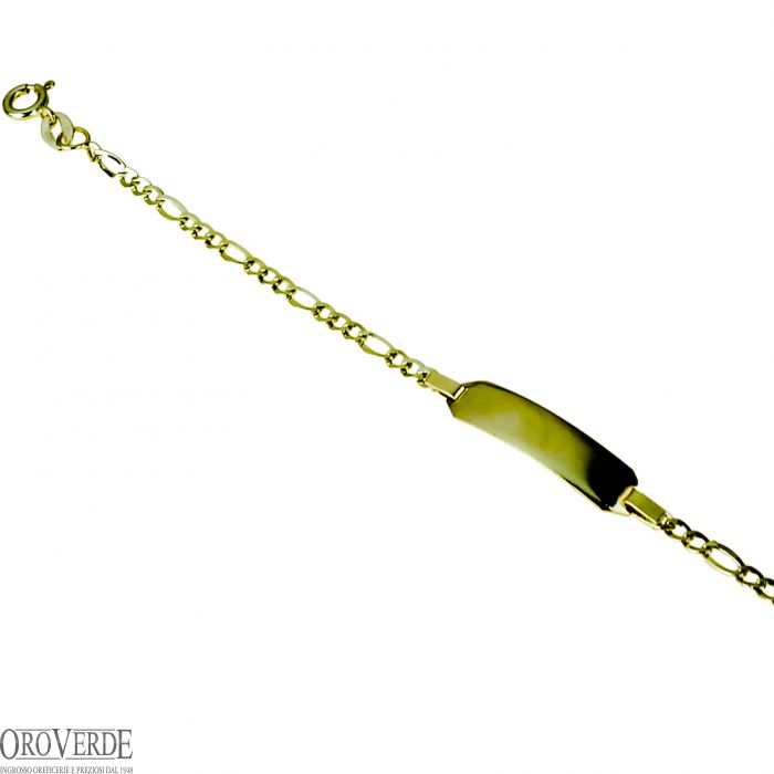 Bracciale con targa, realizzato con una raffinata catenina tipo tre più uno, caratterizzata da un design delicato e proporzionato. La targa centrale, di forma rettangolare, offre ampio spazio per personalizzazioni, permettendo di esaltare la funzionalità del gioiello senza compromettere l'estetica. La lavorazione artigianale garantisce un'ottima finitura e una resa visiva di alta qualità, conferendo al bracciale un aspetto elegante e versatile, adatto per ogni occasione.