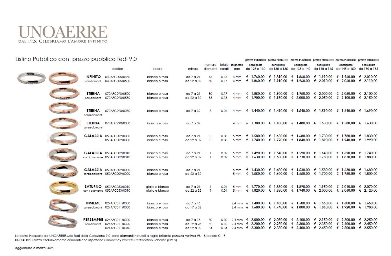 Non perdere l'occasione di rendere speciale il tuo giorno con il kit fedi 9.0 di Unoaerre. Disponibile ora, questo set è un investimento nel tuo futuro insieme, un simbolo di un legame che durerà per sempre. Scegli l'eleganza, scegli Unoaerre.