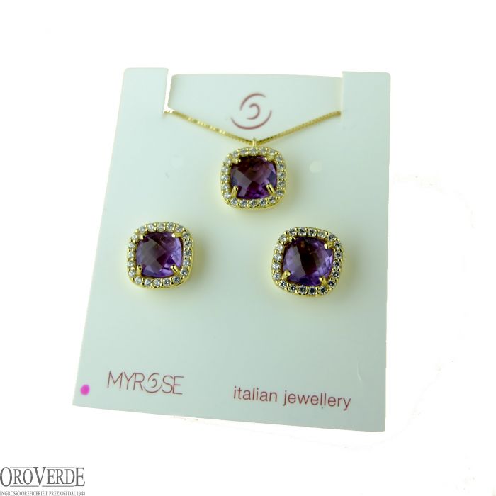 La parure è composta da un'elegante pietra viola di 6 mm, montata su una struttura a 4 griffe che ne esalta la brillantezza e il colore, conferendo al gioiello un aspetto sofisticato. La catenina veneziana, lunga 42 cm e dotata di riduzione a 40 cm, garantisce una vestibilità versatile e confortevole, mentre la chiusura a moschettone assicura praticità e sicurezza nell'indosso. Il pavè di zirconi, sapientemente incastonato, arricchisce il design con un ulteriore tocco di luce, rendendo questa parure un'opzione ideale per il mercato della gioielleria di alta qualità.